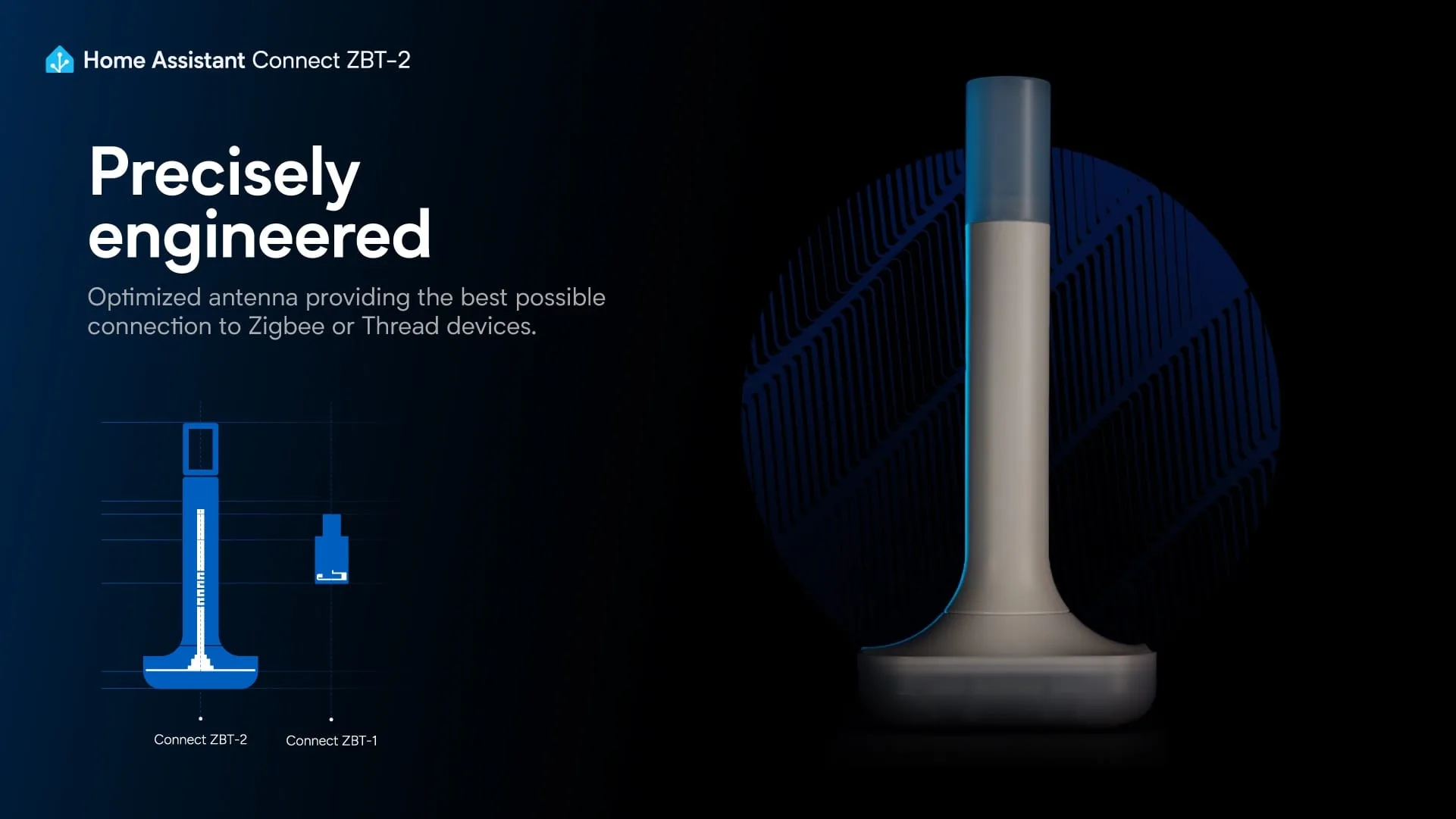 - A méret sem véletlen: a 24 mm átmérőjű, 164 mm magas antenna és az optimalizált alaplemez mind a fizika törvényeinek megfelelően lettek kialakítva, hogy a 2.4 GHz-es Zigbee és Thread frekvenciák maximális teljesítménnyel és hatótávolsággal működjenek.
